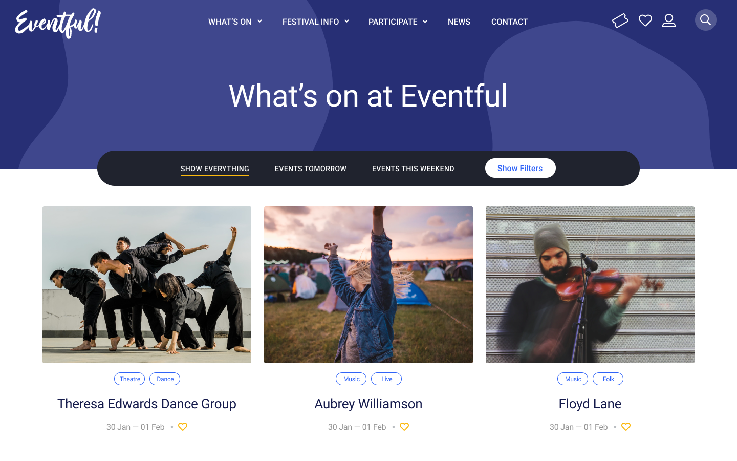 Crafted by digital specialists in the arts and festivals sector, Eventful pairs best practice user experience design with intuitive content management. Benefit from years of arts experience, brought together into this comprehensive event website solution.